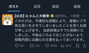 にゃ~言ってたやつが急に深くお詫び申し上げます。とか言うの想像するとちょっと面白い