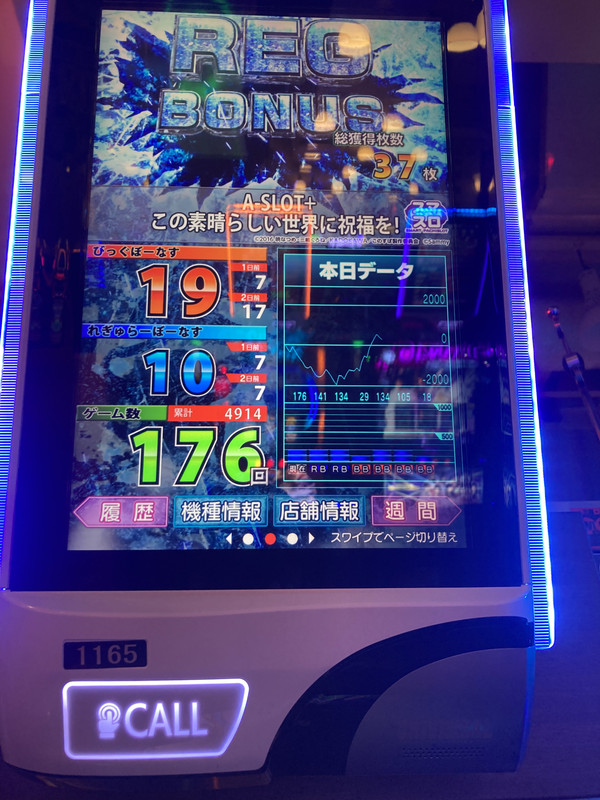 店長カスタムで金トロ出た多分4の台打ったけど1万G回して2以上確定は夜8時頃に祝福カットイン金が1回出ただけだった