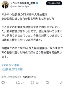 合計1024台のマルハン池袋店として… pic.twitter.com/aGG9SLnoG5— シラカワ@池袋店_店長 (@maruiketentyou) April 25, 2025